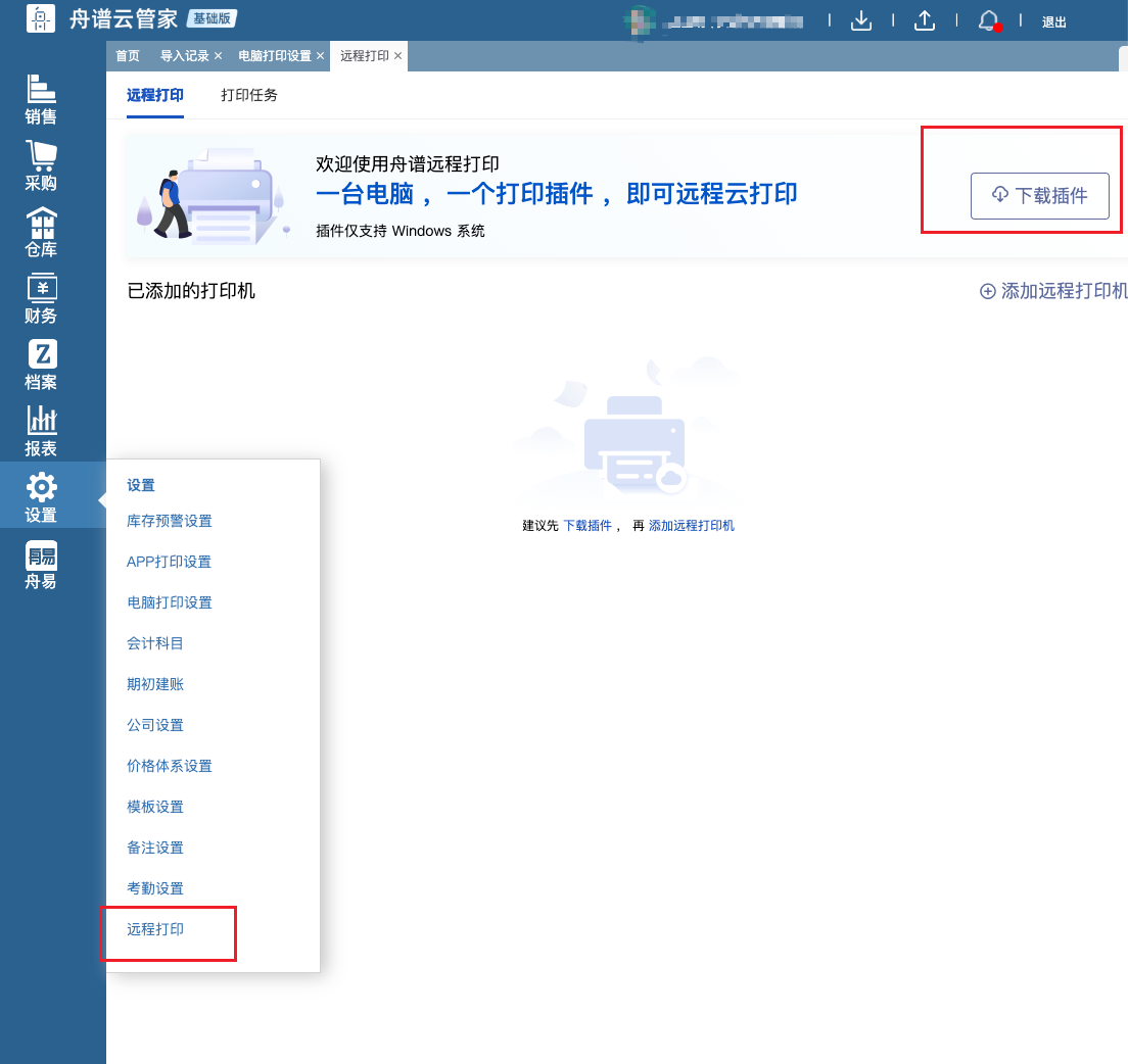 一、菜单【设置】=>【远程打印】=>【下载插件】