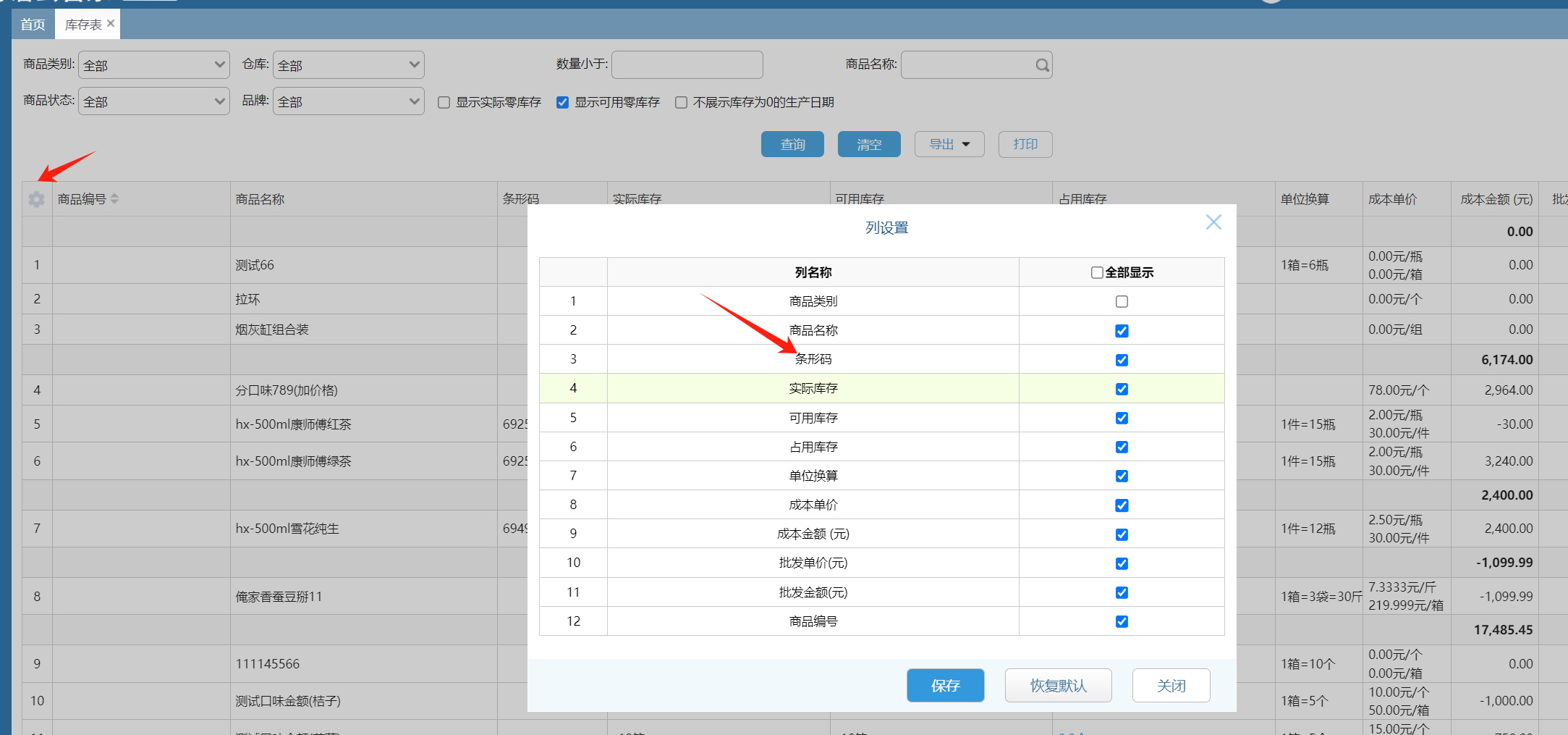检查-列设置-条形码是否勾选,不支持规格显示。