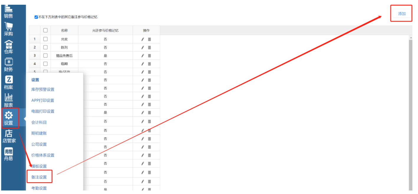 (2)电脑端--设置--备注设置页面右上角点击“添加”;
