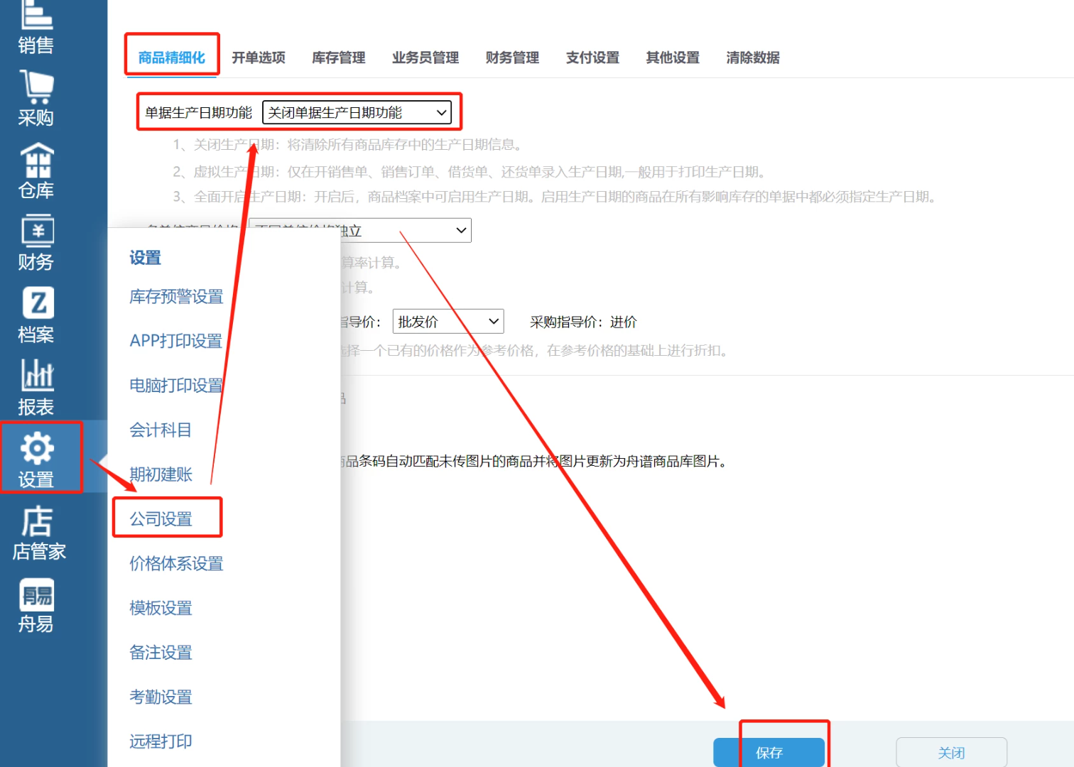 二、关闭所有商品生产日期功能:电脑端--设置--公司设置--商品精细化--关闭单据生产日期功能。