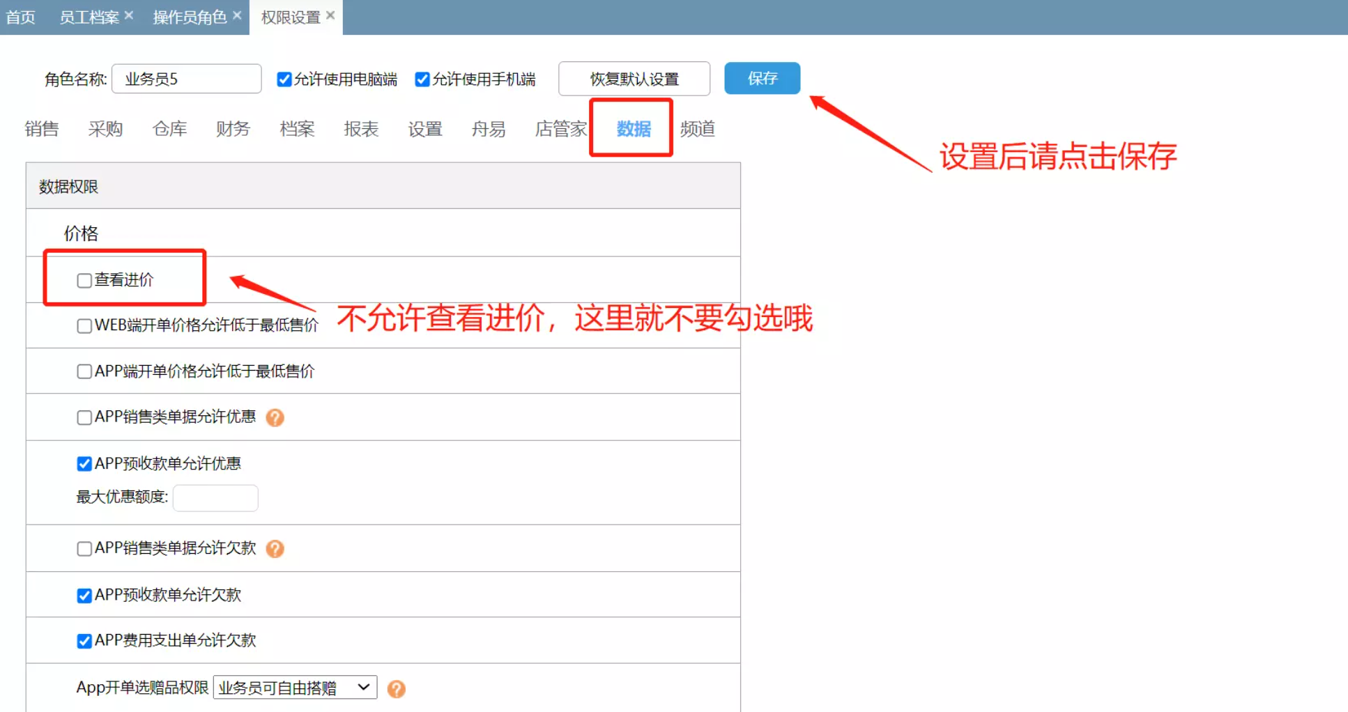 设置后,包括商品档案、单据、各类报表中成本价都不允许查看。