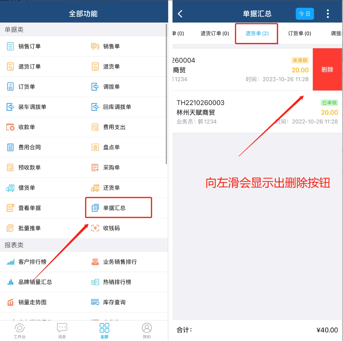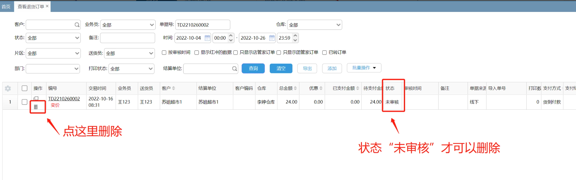 一:电脑端:在对应的单据查看页面,找到需要删除的单据,点击“垃圾桶”图标删除。已审核的单据不支持删除,只能红冲作废。