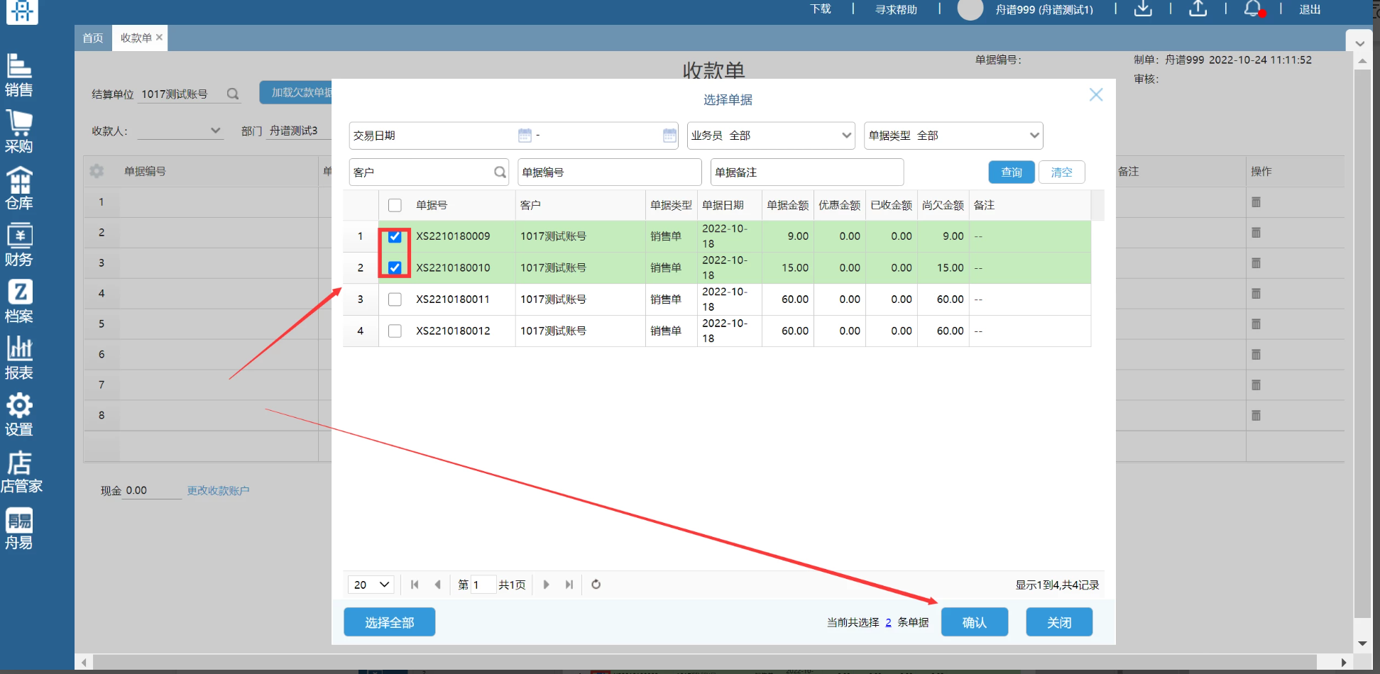 第二步:选择欠款单据-确认。