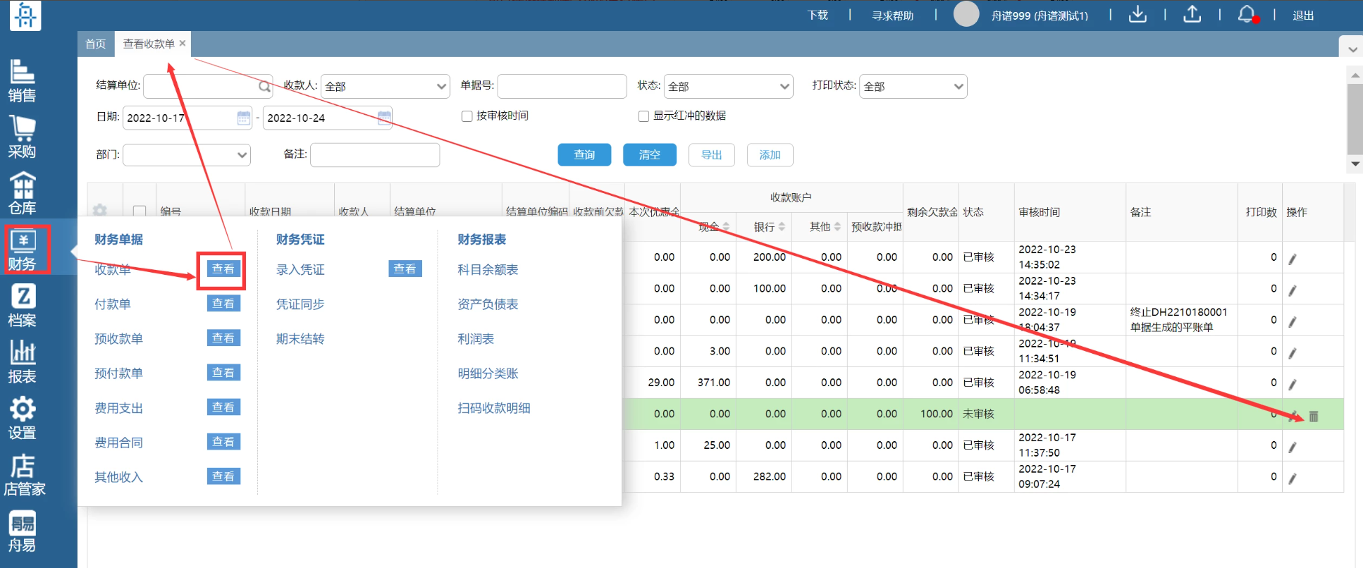 (2)未审核的单据,您可以点击后方的查看,进入后可进行删除。