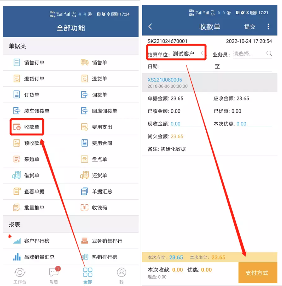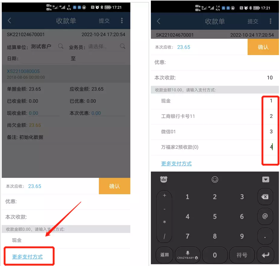 全部-收款单-支付方式-更多支付方式,填写收款金额即可。