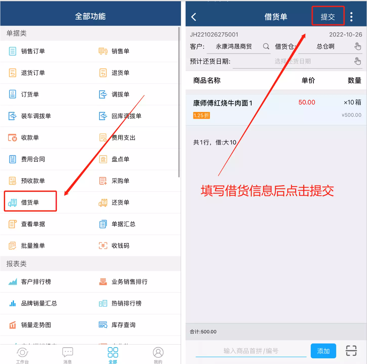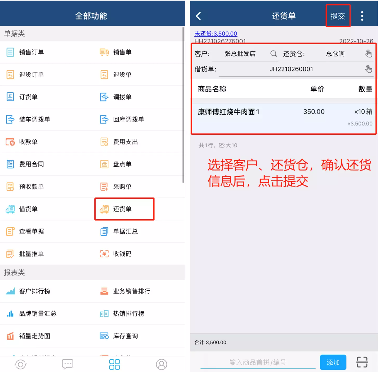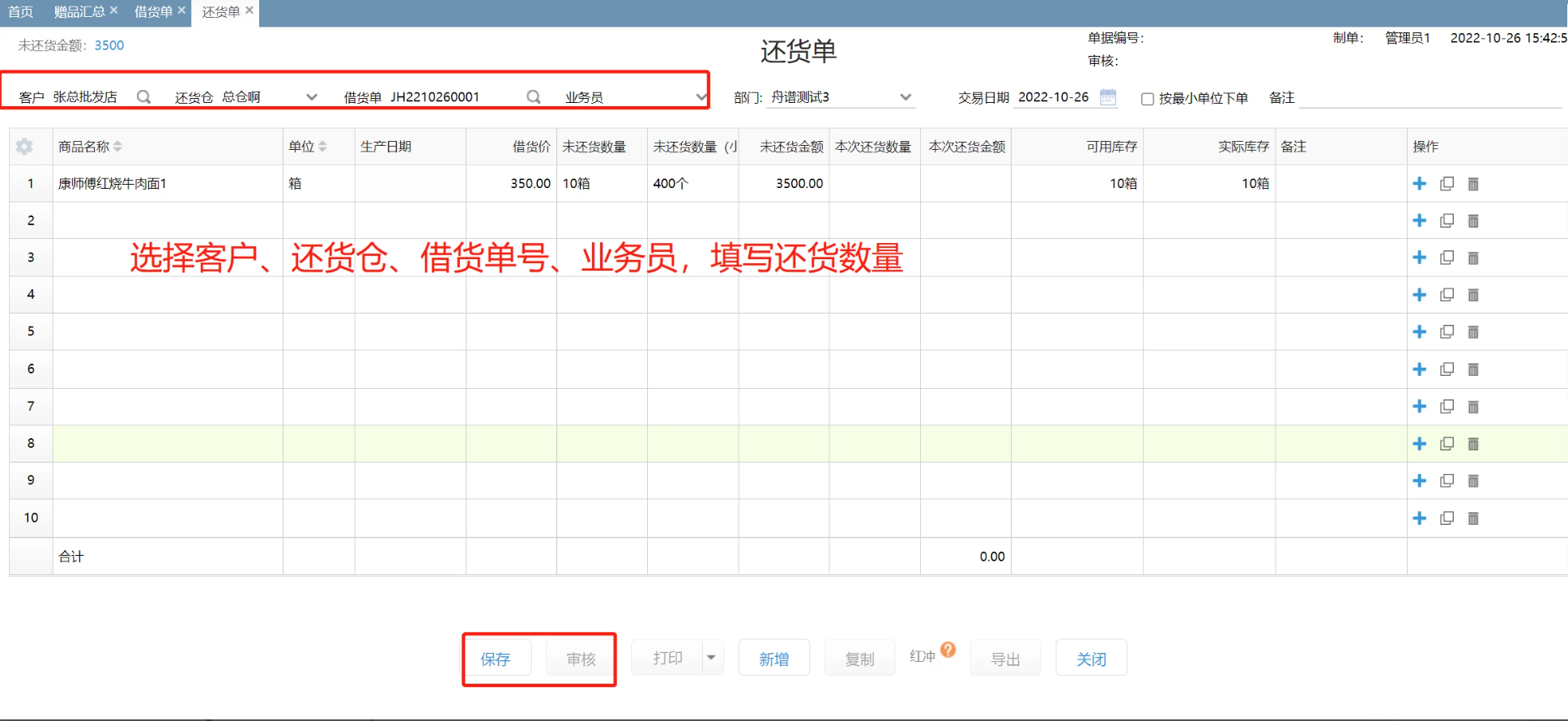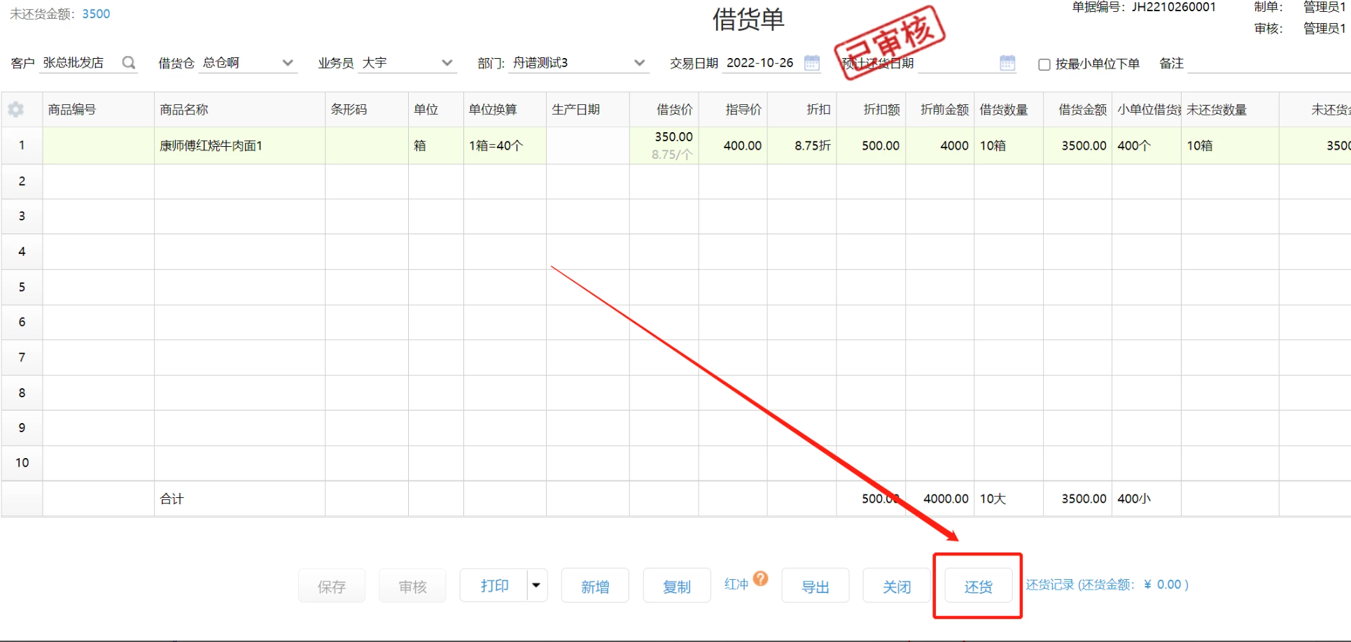 方式一:开一张还货单,选择客户、还货仓库、借货单号操作还货。