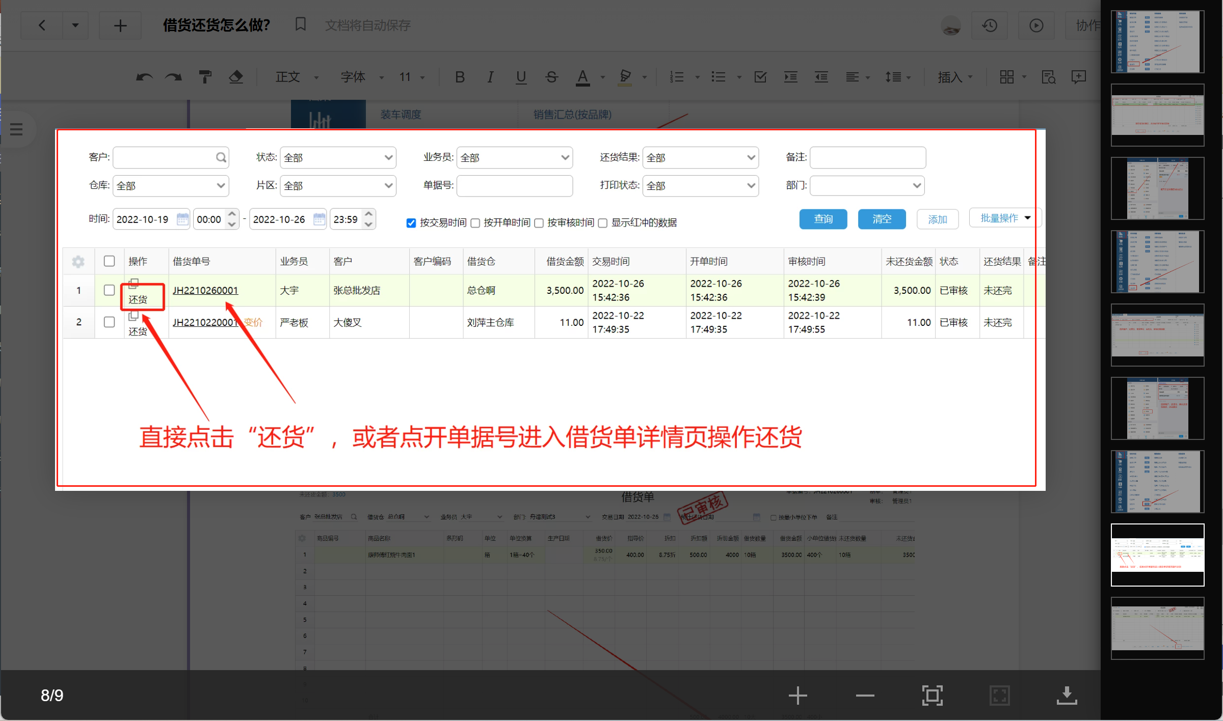 方式二:电脑端点击借货单查看,在借货单详情页点击“还货”。
